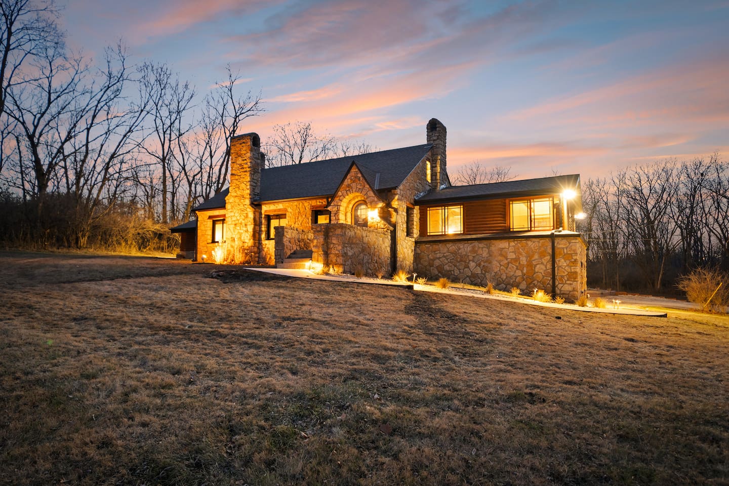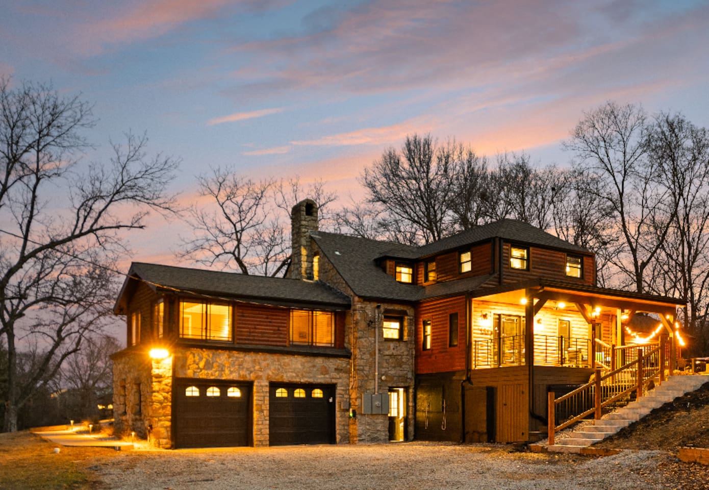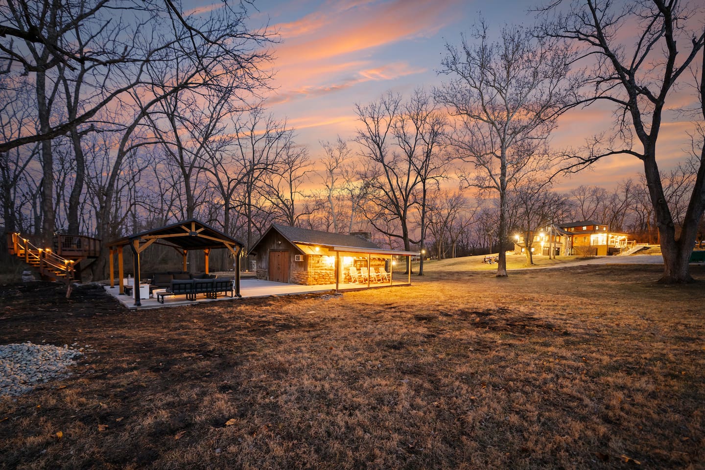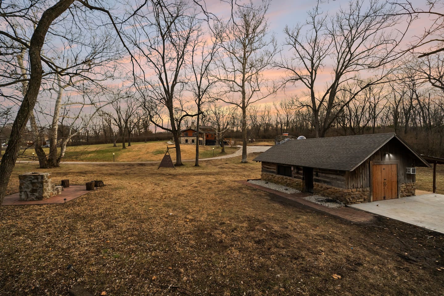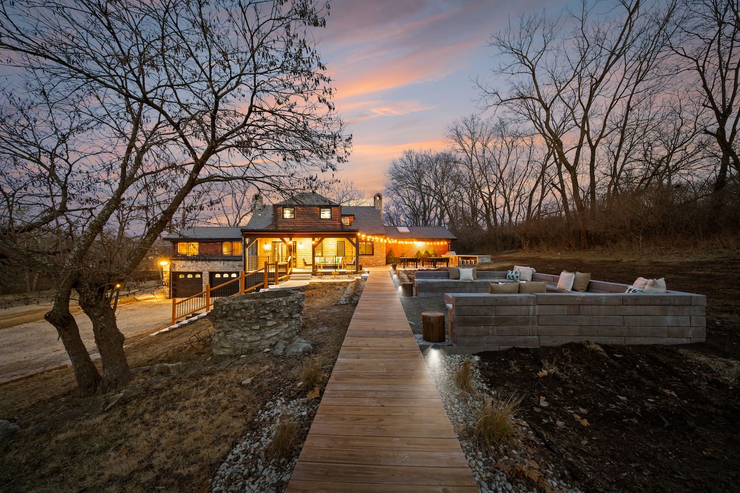 KEY FEATURES: 🌲 Sleeps 21! 5 bedrooms in the main house + 8 beds in the historic creekside cabin (Read more below) 🌲 5 full bathrooms, including a luxurious clawfoot soaking tub & multiple rain showers 🌲 Modern renovated kitchen + full outdoor kitchen with grill, ice trough, & mini fridge 🌲 Zen garden with hot tub, sauna, cold plunge, & outdoor shower 🌲 Firepit lounge w/ natural gas + outdoor dining for 21 🌲 Stargazing dome, movie theater, swing set & rock wall 🌲 Private disc golf course, archery range, treehouse, & tug-a-war 🌲 Outdoor games like bucket golf & portable soccer nets 🌲 Tesla Universal EV Charger w/ Integrated J1772 adapter 🌲 Game room w/ arcade games, pool table, darts, ping pong, & more! 🌲 Fast 3 Gig Google Fiber WiFi + Smart TVs + Netflix access 🌲 Pets welcome ($100 per pet fee) 🌲 Newly renovated, first available stay December 22nd 𖠰 Be Among the First to Stay 𖠰 We are so excited to have started welcoming our first guests in December 2025! The Ev Lodge was designed as a place for families & friends to reconnect where modern comfort meets the nostalgic spirit of summer camp. 𖠰LARGE GROUPS-READ BEFORE BOOKING𖠰 Ev Lodge comfortably sleeps up to 21 guests across two unique spaces. For the best experience with 10+ adults, we strongly recommend only booking mid-March through mid-November. During winter months guests sleeping in the cabin should plan for cozy layers and may prefer to keep kids or cold sensitive guests in the main house. This historic cabin by the creek is a structure dating back to the 1800's where a young President Truman is said to have spent time! It has been transformed into a bunk-style retreat with 4 full-size bunk beds, creating a nostalgic summer camp feel for kids or group getaways. Equipped with an electric fireplace, electric space heater, 3 ceiling fans, AC, and walkie-talkies to stay connected with the main cabin! Located 200 yards away is the main cabin which sleeps 13 guests and features 5 beautifully designed bedrooms, each with a king-size bed and cozy duvet bedding. Two upstairs bedrooms include twin bed sleeping nooks, perfect for little ones. A queen air mattress is stored in the upstairs hallway closet for added flexibility. 𖠰 BATHROOMS 𖠰 With 5 full bathrooms, everyone can get ready without a wait. The main floor primary suite features a clawfoot soaking tub for a touch of spa like indulgence. The second main floor bathroom includes a double vanity, dual rain shower heads, and heated floors! The basement bathroom offers a sleek rainfall shower and allows for easy access for those sleeping at "Camp Truman" by the creek. Each space is stocked with plush towels, toiletries, and thoughtful touches to make your stay effortless. 𖠰 KITCHEN DINING & LOUNGE 𖠰 At the heart of Ev Lodge is a renovated kitchen with stainless steel appliances. It’s perfect for everything from pancake mornings to serving up evening wine hours. Step into your indoor dining for 18 people with a kids table located in the living room. Let in the natural air by opening the 9 foot wide bi-fold doors to access your outdoor kitchen, equipped with a natural gas grill, mini fridge and ice trough. Enjoy outdoor dining for up to 21 guests under the string lights. Back inside, the living room invites you to unwind on a 13.5-foot sectional and gather around the cozy electric fireplace. This room is stocked with board games & arts and crafts so your kids will feel right at home! Unwind watching your favorite show on the large Roku Smart TV equipped with Netflix during your stay. 𖠰 OUTDOOR SPACE 𖠰 Ev Lodge’s 6-acre grounds are where the nostalgia truly happens. Relax in the Zen garden, complete with a hot tub, 4-person sauna, cold plunge, and outdoor shower. Watch the stars from the stargazing dome, toast s’mores at the firepit lounge, or enjoy dinner under the string lights. Adventure seekers will love the private disc golf course, laser tag, archery range, tug-of-war area, soccer nets, and bucket golf! Enjoy your morning coffee in the treehouse overlooking the creek or grab your favorite book and relax on the treehouse hammock floor. The swing set and rock wall are sure to bring out everyone’s inner kid! When the sun sets cue up your favorite film in the outdoor movie theater by the creek. With enough seating for 21 people, it's a perfect end to a perfect day. Just outside of the garage is a Tesla Universal EV Charger w/ Integrated J1772 adapter to conveniently charge any electric vehicle. Whether a Tesla or non-Tesla, get up to 44 mi of range added per hour at 11.5 kW. 𖠰 INDOOR ENTERTAINMENT 𖠰 Rainy days are no problem here. Head to the game room featuring arcade games, foosball, ping pong, pool table, darts, and a KC Current soccer zone! WiFi is lightning-fast (3 Gig Google Fiber) and the house includes a Netflix account. Board games and kids’ crafts are located in the living room to keep everyone entertained. 𖠰 Book Your Stay at The Ev Lodge & Experience Where Luxury Meets Nostalgia 𖠰