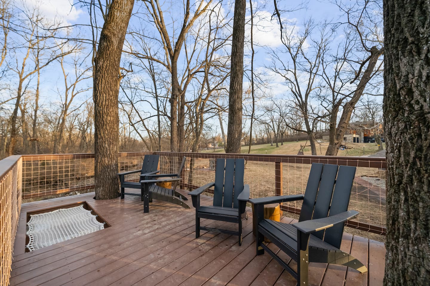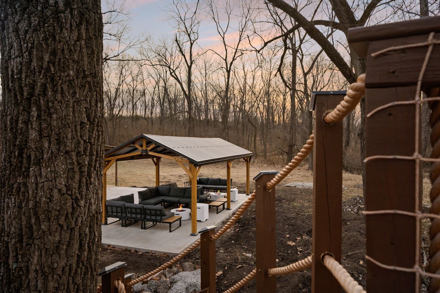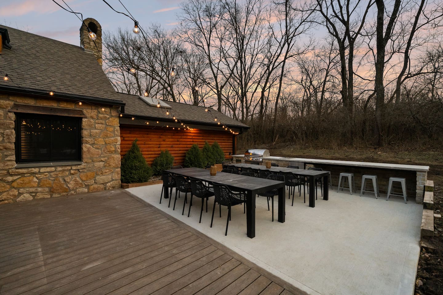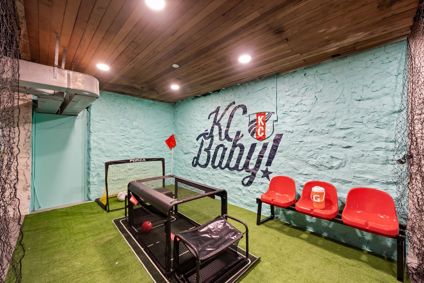 KEY FEATURES: 🌲 Sleeps 21! 5 bedrooms in the main house + 8 beds in the historic creekside cabin (Read more below) 🌲 5 full bathrooms, including a luxurious clawfoot soaking tub & multiple rain showers 🌲 Modern renovated kitchen + full outdoor kitchen with grill, ice trough, & mini fridge 🌲 Zen garden with hot tub, sauna, cold plunge, & outdoor shower 🌲 Firepit lounge w/ natural gas + outdoor dining for 21 🌲 Stargazing dome, movie theater, swing set & rock wall 🌲 Private disc golf course, archery range, treehouse, & tug-a-war 🌲 Outdoor games like bucket golf & portable soccer nets 🌲 Tesla Universal EV Charger w/ Integrated J1772 adapter 🌲 Game room w/ arcade games, pool table, darts, ping pong, & more! 🌲 Fast 3 Gig Google Fiber WiFi + Smart TVs + Netflix access 🌲 Pets welcome ($100 per pet fee) 🌲 Newly renovated, first available stay December 22nd 𖠰 Be Among the First to Stay 𖠰 We are so excited to have started welcoming our first guests in December 2025! The Ev Lodge was designed as a place for families & friends to reconnect where modern comfort meets the nostalgic spirit of summer camp. 𖠰LARGE GROUPS-READ BEFORE BOOKING𖠰 Ev Lodge comfortably sleeps up to 21 guests across two unique spaces. For the best experience with 10+ adults, we strongly recommend only booking mid-March through mid-November. During winter months guests sleeping in the cabin should plan for cozy layers and may prefer to keep kids or cold sensitive guests in the main house. This historic cabin by the creek is a structure dating back to the 1800's where a young President Truman is said to have spent time! It has been transformed into a bunk-style retreat with 4 full-size bunk beds, creating a nostalgic summer camp feel for kids or group getaways. Equipped with an electric fireplace, electric space heater, 3 ceiling fans, AC, and walkie-talkies to stay connected with the main cabin! Located 200 yards away is the main cabin which sleeps 13 guests and features 5 beautifully designed bedrooms, each with a king-size bed and cozy duvet bedding. Two upstairs bedrooms include twin bed sleeping nooks, perfect for little ones. A queen air mattress is stored in the upstairs hallway closet for added flexibility. 𖠰 BATHROOMS 𖠰 With 5 full bathrooms, everyone can get ready without a wait. The main floor primary suite features a clawfoot soaking tub for a touch of spa like indulgence. The second main floor bathroom includes a double vanity, dual rain shower heads, and heated floors! The basement bathroom offers a sleek rainfall shower and allows for easy access for those sleeping at "Camp Truman" by the creek. Each space is stocked with plush towels, toiletries, and thoughtful touches to make your stay effortless. 𖠰 KITCHEN DINING & LOUNGE 𖠰 At the heart of Ev Lodge is a renovated kitchen with stainless steel appliances. It’s perfect for everything from pancake mornings to serving up evening wine hours. Step into your indoor dining for 18 people with a kids table located in the living room. Let in the natural air by opening the 9 foot wide bi-fold doors to access your outdoor kitchen, equipped with a natural gas grill, mini fridge and ice trough. Enjoy outdoor dining for up to 21 guests under the string lights. Back inside, the living room invites you to unwind on a 13.5-foot sectional and gather around the cozy electric fireplace. This room is stocked with board games & arts and crafts so your kids will feel right at home! Unwind watching your favorite show on the large Roku Smart TV equipped with Netflix during your stay. 𖠰 OUTDOOR SPACE 𖠰 Ev Lodge’s 6-acre grounds are where the nostalgia truly happens. Relax in the Zen garden, complete with a hot tub, 4-person sauna, cold plunge, and outdoor shower. Watch the stars from the stargazing dome, toast s’mores at the firepit lounge, or enjoy dinner under the string lights. Adventure seekers will love the private disc golf course, laser tag, archery range, tug-of-war area, soccer nets, and bucket golf! Enjoy your morning coffee in the treehouse overlooking the creek or grab your favorite book and relax on the treehouse hammock floor. The swing set and rock wall are sure to bring out everyone’s inner kid! When the sun sets cue up your favorite film in the outdoor movie theater by the creek. With enough seating for 21 people, it's a perfect end to a perfect day. Just outside of the garage is a Tesla Universal EV Charger w/ Integrated J1772 adapter to conveniently charge any electric vehicle. Whether a Tesla or non-Tesla, get up to 44 mi of range added per hour at 11.5 kW. 𖠰 INDOOR ENTERTAINMENT 𖠰 Rainy days are no problem here. Head to the game room featuring arcade games, foosball, ping pong, pool table, darts, and a KC Current soccer zone! WiFi is lightning-fast (3 Gig Google Fiber) and the house includes a Netflix account. Board games and kids’ crafts are located in the living room to keep everyone entertained. 𖠰 Book Your Stay at The Ev Lodge & Experience Where Luxury Meets Nostalgia 𖠰