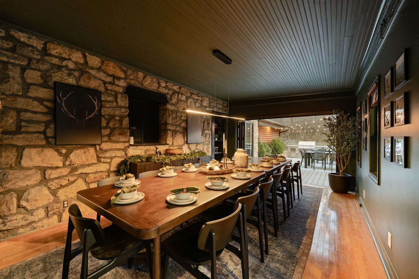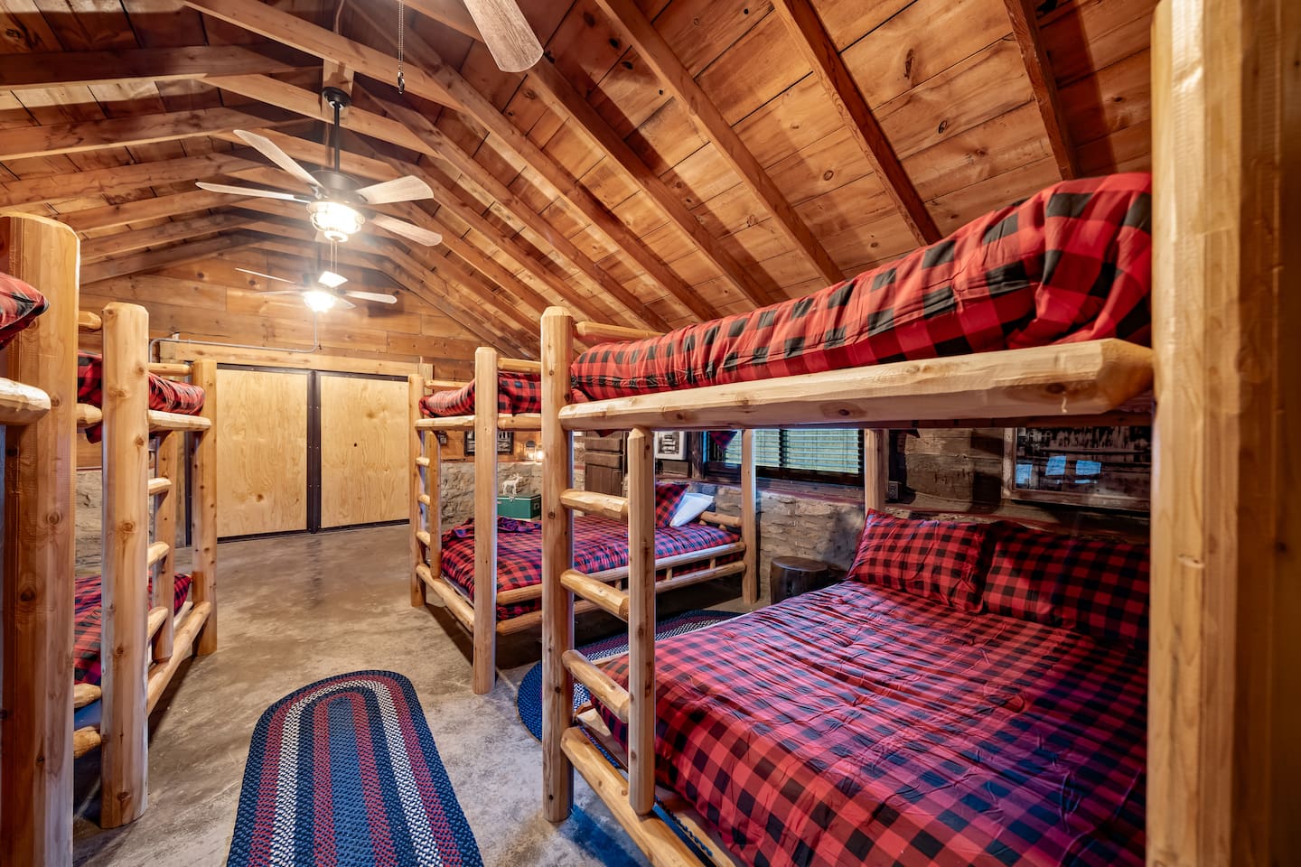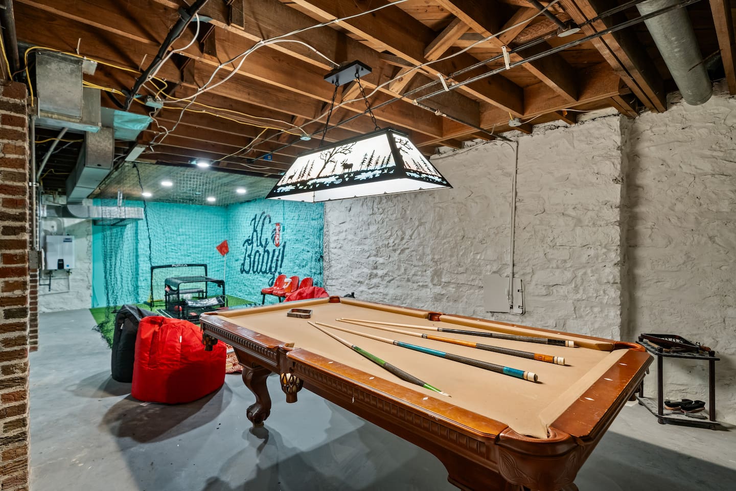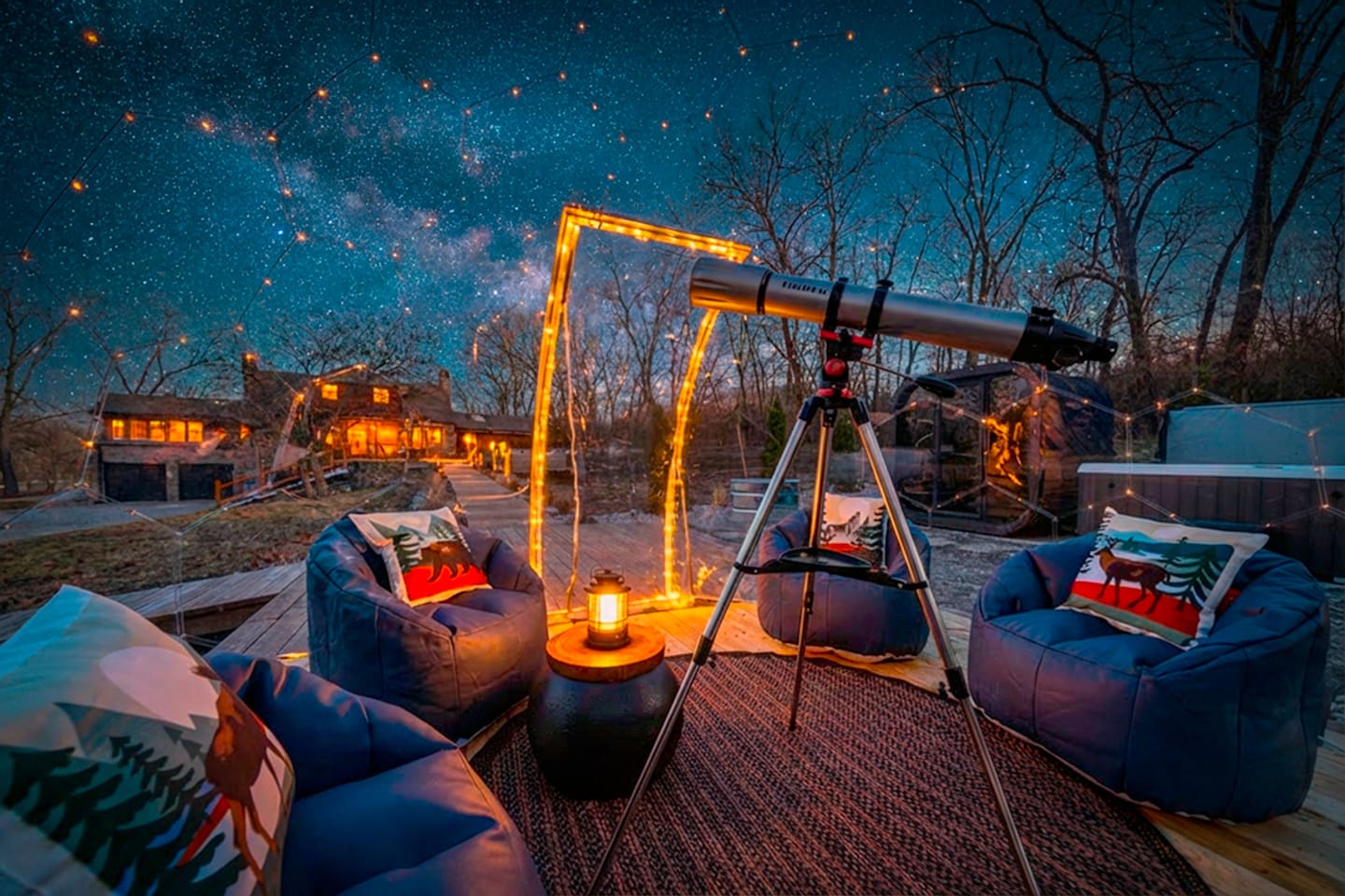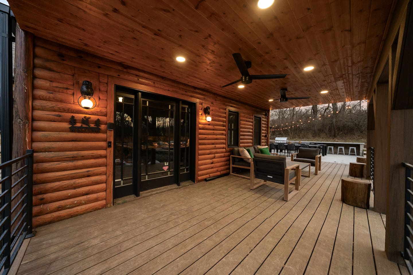 KEY FEATURES: 🌲 Sleeps 21! 5 bedrooms in the main house + 8 beds in the historic creekside cabin (Read more below) 🌲 5 full bathrooms, including a luxurious clawfoot soaking tub & multiple rain showers 🌲 Modern renovated kitchen + full outdoor kitchen with grill, ice trough, & mini fridge 🌲 Zen garden with hot tub, sauna, cold plunge, & outdoor shower 🌲 Firepit lounge w/ natural gas + outdoor dining for 21 🌲 Stargazing dome, movie theater, swing set & rock wall 🌲 Private disc golf course, archery range, treehouse, & tug-a-war 🌲 Outdoor games like bucket golf & portable soccer nets 🌲 Tesla Universal EV Charger w/ Integrated J1772 adapter 🌲 Game room w/ arcade games, pool table, darts, ping pong, & more! 🌲 Fast 3 Gig Google Fiber WiFi + Smart TVs + Netflix access 🌲 Pets welcome ($100 per pet fee) 🌲 Newly renovated, first available stay December 22nd 𖠰 Be Among the First to Stay 𖠰 We are so excited to have started welcoming our first guests in December 2025! The Ev Lodge was designed as a place for families & friends to reconnect where modern comfort meets the nostalgic spirit of summer camp. 𖠰LARGE GROUPS-READ BEFORE BOOKING𖠰 Ev Lodge comfortably sleeps up to 21 guests across two unique spaces. For the best experience with 10+ adults, we strongly recommend only booking mid-March through mid-November. During winter months guests sleeping in the cabin should plan for cozy layers and may prefer to keep kids or cold sensitive guests in the main house. This historic cabin by the creek is a structure dating back to the 1800's where a young President Truman is said to have spent time! It has been transformed into a bunk-style retreat with 4 full-size bunk beds, creating a nostalgic summer camp feel for kids or group getaways. Equipped with an electric fireplace, electric space heater, 3 ceiling fans, AC, and walkie-talkies to stay connected with the main cabin! Located 200 yards away is the main cabin which sleeps 13 guests and features 5 beautifully designed bedrooms, each with a king-size bed and cozy duvet bedding. Two upstairs bedrooms include twin bed sleeping nooks, perfect for little ones. A queen air mattress is stored in the upstairs hallway closet for added flexibility. 𖠰 BATHROOMS 𖠰 With 5 full bathrooms, everyone can get ready without a wait. The main floor primary suite features a clawfoot soaking tub for a touch of spa like indulgence. The second main floor bathroom includes a double vanity, dual rain shower heads, and heated floors! The basement bathroom offers a sleek rainfall shower and allows for easy access for those sleeping at "Camp Truman" by the creek. Each space is stocked with plush towels, toiletries, and thoughtful touches to make your stay effortless. 𖠰 KITCHEN DINING & LOUNGE 𖠰 At the heart of Ev Lodge is a renovated kitchen with stainless steel appliances. It’s perfect for everything from pancake mornings to serving up evening wine hours. Step into your indoor dining for 18 people with a kids table located in the living room. Let in the natural air by opening the 9 foot wide bi-fold doors to access your outdoor kitchen, equipped with a natural gas grill, mini fridge and ice trough. Enjoy outdoor dining for up to 21 guests under the string lights. Back inside, the living room invites you to unwind on a 13.5-foot sectional and gather around the cozy electric fireplace. This room is stocked with board games & arts and crafts so your kids will feel right at home! Unwind watching your favorite show on the large Roku Smart TV equipped with Netflix during your stay. 𖠰 OUTDOOR SPACE 𖠰 Ev Lodge’s 6-acre grounds are where the nostalgia truly happens. Relax in the Zen garden, complete with a hot tub, 4-person sauna, cold plunge, and outdoor shower. Watch the stars from the stargazing dome, toast s’mores at the firepit lounge, or enjoy dinner under the string lights. Adventure seekers will love the private disc golf course, laser tag, archery range, tug-of-war area, soccer nets, and bucket golf! Enjoy your morning coffee in the treehouse overlooking the creek or grab your favorite book and relax on the treehouse hammock floor. The swing set and rock wall are sure to bring out everyone’s inner kid! When the sun sets cue up your favorite film in the outdoor movie theater by the creek. With enough seating for 21 people, it's a perfect end to a perfect day. Just outside of the garage is a Tesla Universal EV Charger w/ Integrated J1772 adapter to conveniently charge any electric vehicle. Whether a Tesla or non-Tesla, get up to 44 mi of range added per hour at 11.5 kW. 𖠰 INDOOR ENTERTAINMENT 𖠰 Rainy days are no problem here. Head to the game room featuring arcade games, foosball, ping pong, pool table, darts, and a KC Current soccer zone! WiFi is lightning-fast (3 Gig Google Fiber) and the house includes a Netflix account. Board games and kids’ crafts are located in the living room to keep everyone entertained. 𖠰 Book Your Stay at The Ev Lodge & Experience Where Luxury Meets Nostalgia 𖠰
