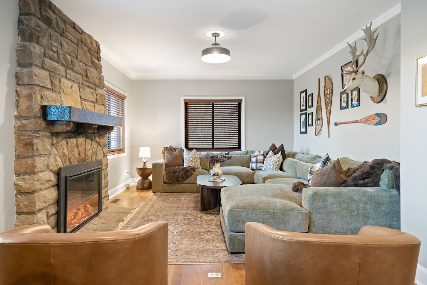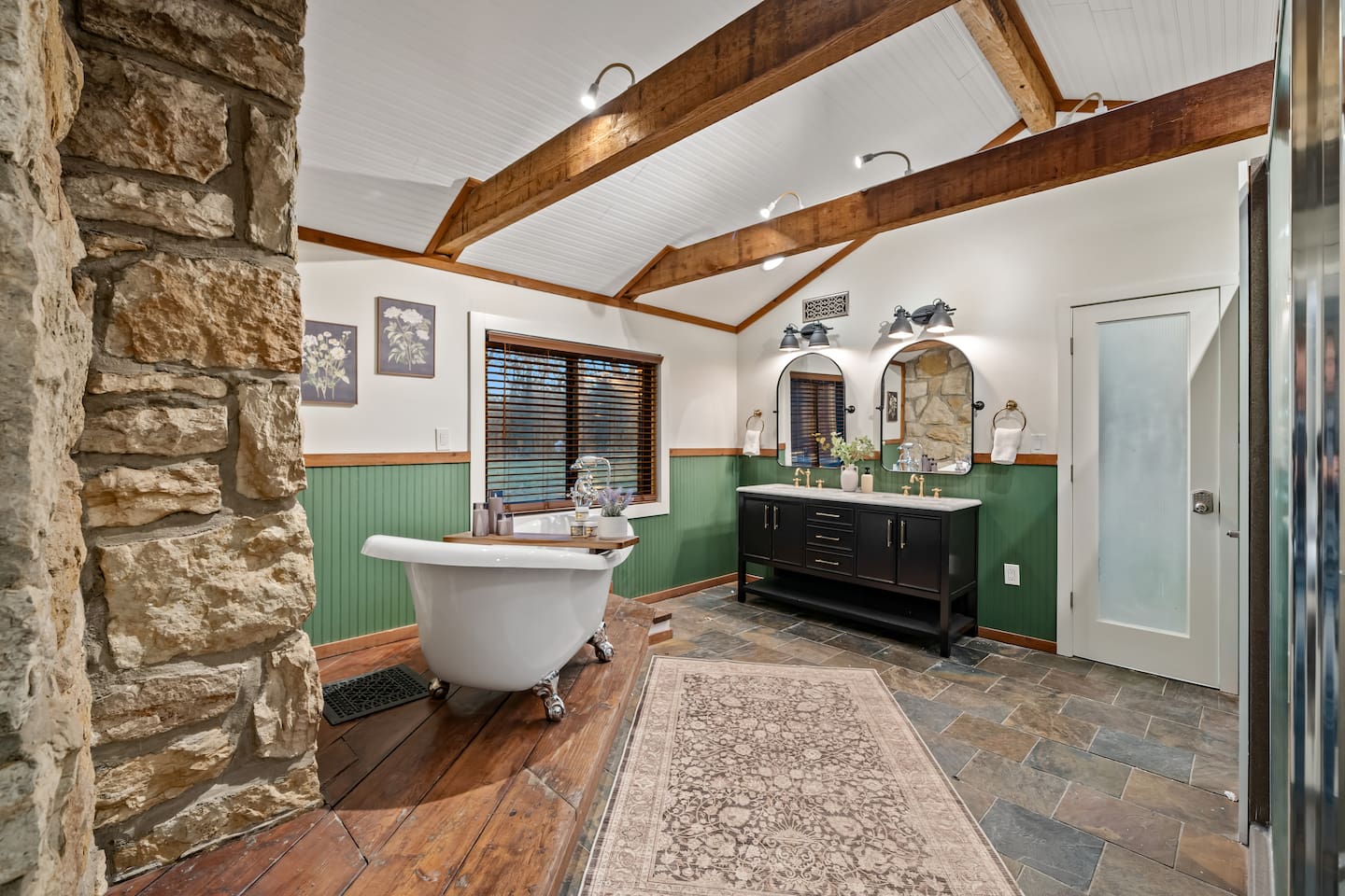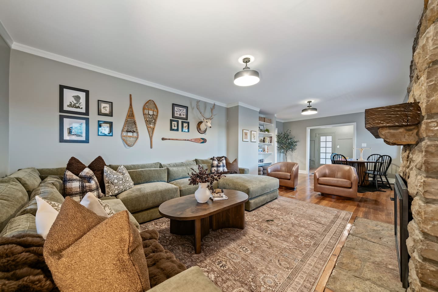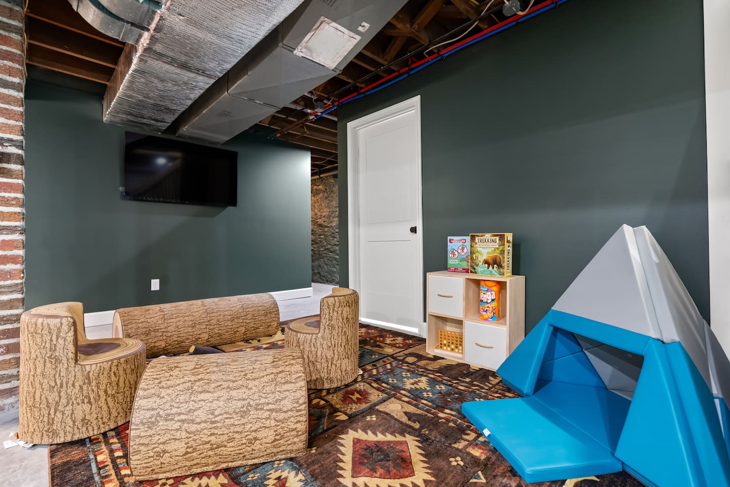 KEY FEATURES: 🌲 Sleeps 21! 5 bedrooms in the main house + 8 beds in the historic creekside cabin (Read more below) 🌲 5 full bathrooms, including a luxurious clawfoot soaking tub & multiple rain showers 🌲 Modern renovated kitchen + full outdoor kitchen with grill, ice trough, & mini fridge 🌲 Zen garden with hot tub, sauna, cold plunge, & outdoor shower 🌲 Firepit lounge w/ natural gas + outdoor dining for 21 🌲 Stargazing dome, movie theater, swing set & rock wall 🌲 Private disc golf course, archery range, treehouse, & tug-a-war 🌲 Outdoor games like bucket golf & portable soccer nets 🌲 Tesla Universal EV Charger w/ Integrated J1772 adapter 🌲 Game room w/ arcade games, pool table, darts, ping pong, & more! 🌲 Fast 3 Gig Google Fiber WiFi + Smart TVs + Netflix access 🌲 Pets welcome ($100 per pet fee) 🌲 Newly renovated, first available stay December 22nd 𖠰 Be Among the First to Stay 𖠰 We are so excited to have started welcoming our first guests in December 2025! The Ev Lodge was designed as a place for families & friends to reconnect where modern comfort meets the nostalgic spirit of summer camp. 𖠰LARGE GROUPS-READ BEFORE BOOKING𖠰 Ev Lodge comfortably sleeps up to 21 guests across two unique spaces. For the best experience with 10+ adults, we strongly recommend only booking mid-March through mid-November. During winter months guests sleeping in the cabin should plan for cozy layers and may prefer to keep kids or cold sensitive guests in the main house. This historic cabin by the creek is a structure dating back to the 1800's where a young President Truman is said to have spent time! It has been transformed into a bunk-style retreat with 4 full-size bunk beds, creating a nostalgic summer camp feel for kids or group getaways. Equipped with an electric fireplace, electric space heater, 3 ceiling fans, AC, and walkie-talkies to stay connected with the main cabin! Located 200 yards away is the main cabin which sleeps 13 guests and features 5 beautifully designed bedrooms, each with a king-size bed and cozy duvet bedding. Two upstairs bedrooms include twin bed sleeping nooks, perfect for little ones. A queen air mattress is stored in the upstairs hallway closet for added flexibility. 𖠰 BATHROOMS 𖠰 With 5 full bathrooms, everyone can get ready without a wait. The main floor primary suite features a clawfoot soaking tub for a touch of spa like indulgence. The second main floor bathroom includes a double vanity, dual rain shower heads, and heated floors! The basement bathroom offers a sleek rainfall shower and allows for easy access for those sleeping at "Camp Truman" by the creek. Each space is stocked with plush towels, toiletries, and thoughtful touches to make your stay effortless. 𖠰 KITCHEN DINING & LOUNGE 𖠰 At the heart of Ev Lodge is a renovated kitchen with stainless steel appliances. It’s perfect for everything from pancake mornings to serving up evening wine hours. Step into your indoor dining for 18 people with a kids table located in the living room. Let in the natural air by opening the 9 foot wide bi-fold doors to access your outdoor kitchen, equipped with a natural gas grill, mini fridge and ice trough. Enjoy outdoor dining for up to 21 guests under the string lights. Back inside, the living room invites you to unwind on a 13.5-foot sectional and gather around the cozy electric fireplace. This room is stocked with board games & arts and crafts so your kids will feel right at home! Unwind watching your favorite show on the large Roku Smart TV equipped with Netflix during your stay. 𖠰 OUTDOOR SPACE 𖠰 Ev Lodge’s 6-acre grounds are where the nostalgia truly happens. Relax in the Zen garden, complete with a hot tub, 4-person sauna, cold plunge, and outdoor shower. Watch the stars from the stargazing dome, toast s’mores at the firepit lounge, or enjoy dinner under the string lights. Adventure seekers will love the private disc golf course, laser tag, archery range, tug-of-war area, soccer nets, and bucket golf! Enjoy your morning coffee in the treehouse overlooking the creek or grab your favorite book and relax on the treehouse hammock floor. The swing set and rock wall are sure to bring out everyone’s inner kid! When the sun sets cue up your favorite film in the outdoor movie theater by the creek. With enough seating for 21 people, it's a perfect end to a perfect day. Just outside of the garage is a Tesla Universal EV Charger w/ Integrated J1772 adapter to conveniently charge any electric vehicle. Whether a Tesla or non-Tesla, get up to 44 mi of range added per hour at 11.5 kW. 𖠰 INDOOR ENTERTAINMENT 𖠰 Rainy days are no problem here. Head to the game room featuring arcade games, foosball, ping pong, pool table, darts, and a KC Current soccer zone! WiFi is lightning-fast (3 Gig Google Fiber) and the house includes a Netflix account. Board games and kids’ crafts are located in the living room to keep everyone entertained. 𖠰 Book Your Stay at The Ev Lodge & Experience Where Luxury Meets Nostalgia 𖠰