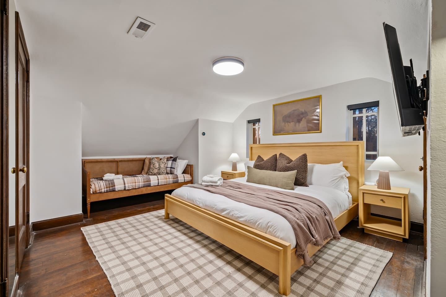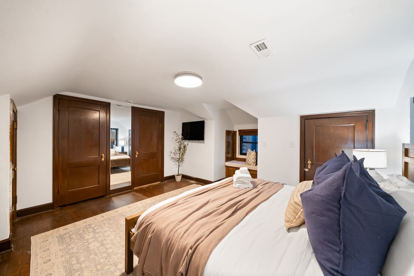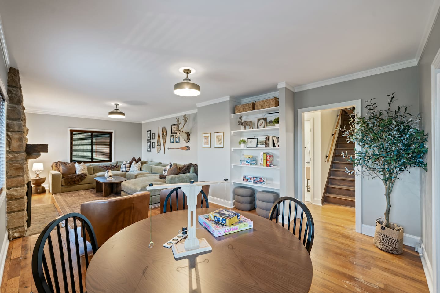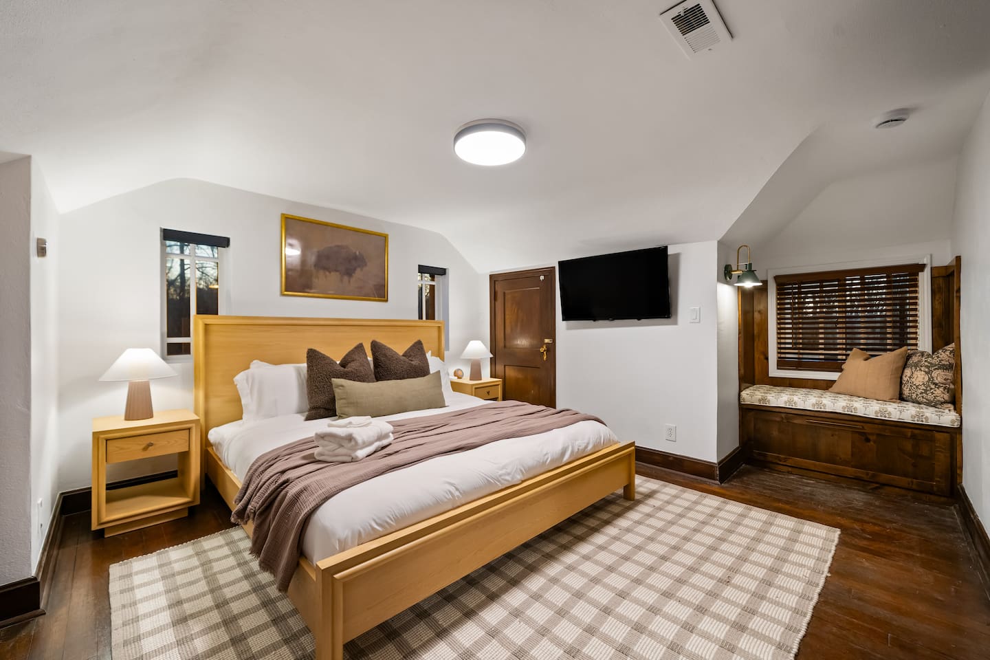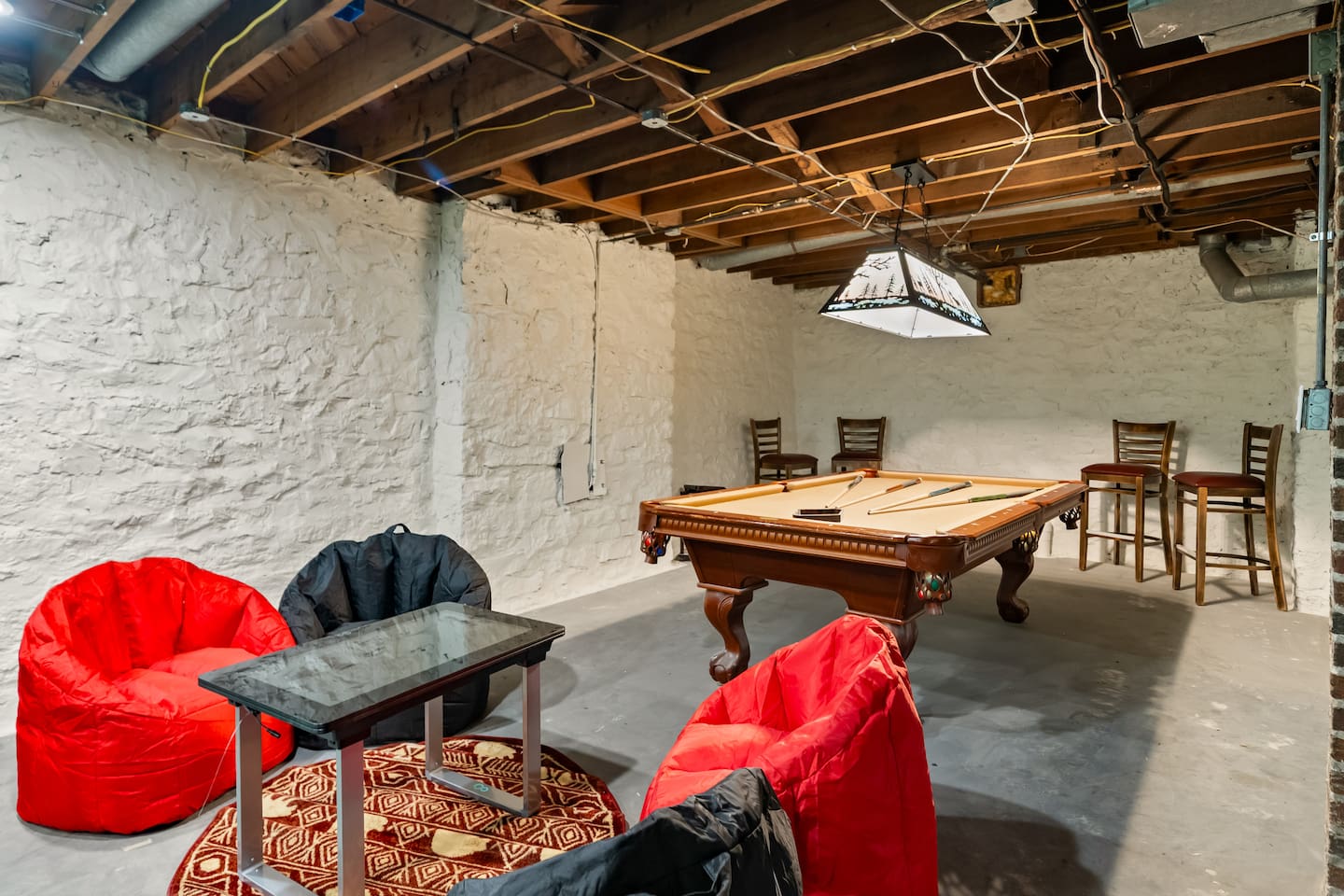 KEY FEATURES: 🌲 Sleeps 21! 5 bedrooms in the main house + 8 beds in the historic creekside cabin (Read more below) 🌲 5 full bathrooms, including a luxurious clawfoot soaking tub & multiple rain showers 🌲 Modern renovated kitchen + full outdoor kitchen with grill, ice trough, & mini fridge 🌲 Zen garden with hot tub, sauna, cold plunge, & outdoor shower 🌲 Firepit lounge w/ natural gas + outdoor dining for 21 🌲 Stargazing dome, movie theater, swing set & rock wall 🌲 Private disc golf course, archery range, treehouse, & tug-a-war 🌲 Outdoor games like bucket golf & portable soccer nets 🌲 Tesla Universal EV Charger w/ Integrated J1772 adapter 🌲 Game room w/ arcade games, pool table, darts, ping pong, & more! 🌲 Fast 3 Gig Google Fiber WiFi + Smart TVs + Netflix access 🌲 Pets welcome ($100 per pet fee) 🌲 Newly renovated, first available stay December 22nd 𖠰 Be Among the First to Stay 𖠰 We are so excited to have started welcoming our first guests in December 2025! The Ev Lodge was designed as a place for families & friends to reconnect where modern comfort meets the nostalgic spirit of summer camp. 𖠰LARGE GROUPS-READ BEFORE BOOKING𖠰 Ev Lodge comfortably sleeps up to 21 guests across two unique spaces. For the best experience with 10+ adults, we strongly recommend only booking mid-March through mid-November. During winter months guests sleeping in the cabin should plan for cozy layers and may prefer to keep kids or cold sensitive guests in the main house. This historic cabin by the creek is a structure dating back to the 1800's where a young President Truman is said to have spent time! It has been transformed into a bunk-style retreat with 4 full-size bunk beds, creating a nostalgic summer camp feel for kids or group getaways. Equipped with an electric fireplace, electric space heater, 3 ceiling fans, AC, and walkie-talkies to stay connected with the main cabin! Located 200 yards away is the main cabin which sleeps 13 guests and features 5 beautifully designed bedrooms, each with a king-size bed and cozy duvet bedding. Two upstairs bedrooms include twin bed sleeping nooks, perfect for little ones. A queen air mattress is stored in the upstairs hallway closet for added flexibility. 𖠰 BATHROOMS 𖠰 With 5 full bathrooms, everyone can get ready without a wait. The main floor primary suite features a clawfoot soaking tub for a touch of spa like indulgence. The second main floor bathroom includes a double vanity, dual rain shower heads, and heated floors! The basement bathroom offers a sleek rainfall shower and allows for easy access for those sleeping at "Camp Truman" by the creek. Each space is stocked with plush towels, toiletries, and thoughtful touches to make your stay effortless. 𖠰 KITCHEN DINING & LOUNGE 𖠰 At the heart of Ev Lodge is a renovated kitchen with stainless steel appliances. It’s perfect for everything from pancake mornings to serving up evening wine hours. Step into your indoor dining for 18 people with a kids table located in the living room. Let in the natural air by opening the 9 foot wide bi-fold doors to access your outdoor kitchen, equipped with a natural gas grill, mini fridge and ice trough. Enjoy outdoor dining for up to 21 guests under the string lights. Back inside, the living room invites you to unwind on a 13.5-foot sectional and gather around the cozy electric fireplace. This room is stocked with board games & arts and crafts so your kids will feel right at home! Unwind watching your favorite show on the large Roku Smart TV equipped with Netflix during your stay. 𖠰 OUTDOOR SPACE 𖠰 Ev Lodge’s 6-acre grounds are where the nostalgia truly happens. Relax in the Zen garden, complete with a hot tub, 4-person sauna, cold plunge, and outdoor shower. Watch the stars from the stargazing dome, toast s’mores at the firepit lounge, or enjoy dinner under the string lights. Adventure seekers will love the private disc golf course, laser tag, archery range, tug-of-war area, soccer nets, and bucket golf! Enjoy your morning coffee in the treehouse overlooking the creek or grab your favorite book and relax on the treehouse hammock floor. The swing set and rock wall are sure to bring out everyone’s inner kid! When the sun sets cue up your favorite film in the outdoor movie theater by the creek. With enough seating for 21 people, it's a perfect end to a perfect day. Just outside of the garage is a Tesla Universal EV Charger w/ Integrated J1772 adapter to conveniently charge any electric vehicle. Whether a Tesla or non-Tesla, get up to 44 mi of range added per hour at 11.5 kW. 𖠰 INDOOR ENTERTAINMENT 𖠰 Rainy days are no problem here. Head to the game room featuring arcade games, foosball, ping pong, pool table, darts, and a KC Current soccer zone! WiFi is lightning-fast (3 Gig Google Fiber) and the house includes a Netflix account. Board games and kids’ crafts are located in the living room to keep everyone entertained. 𖠰 Book Your Stay at The Ev Lodge & Experience Where Luxury Meets Nostalgia 𖠰