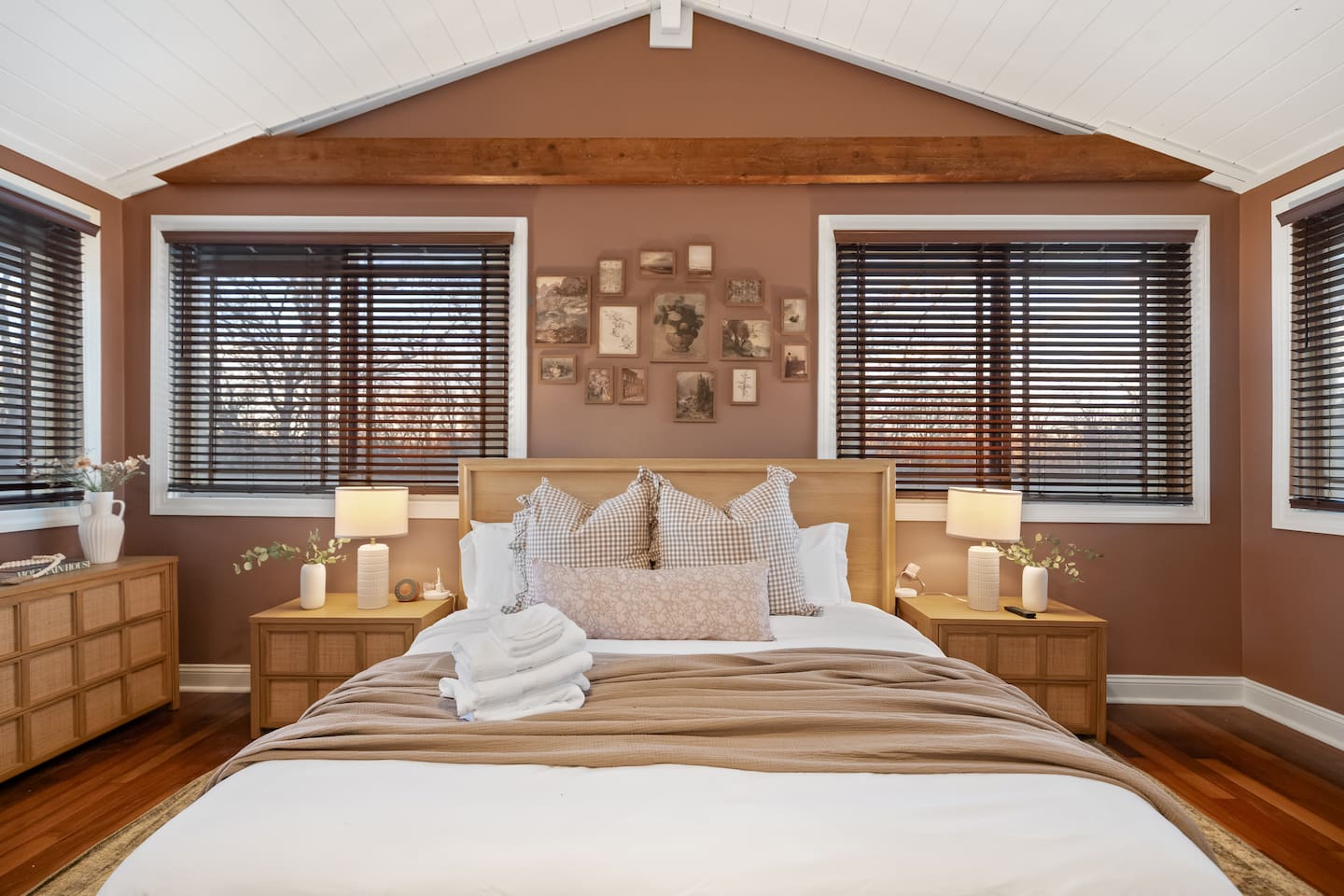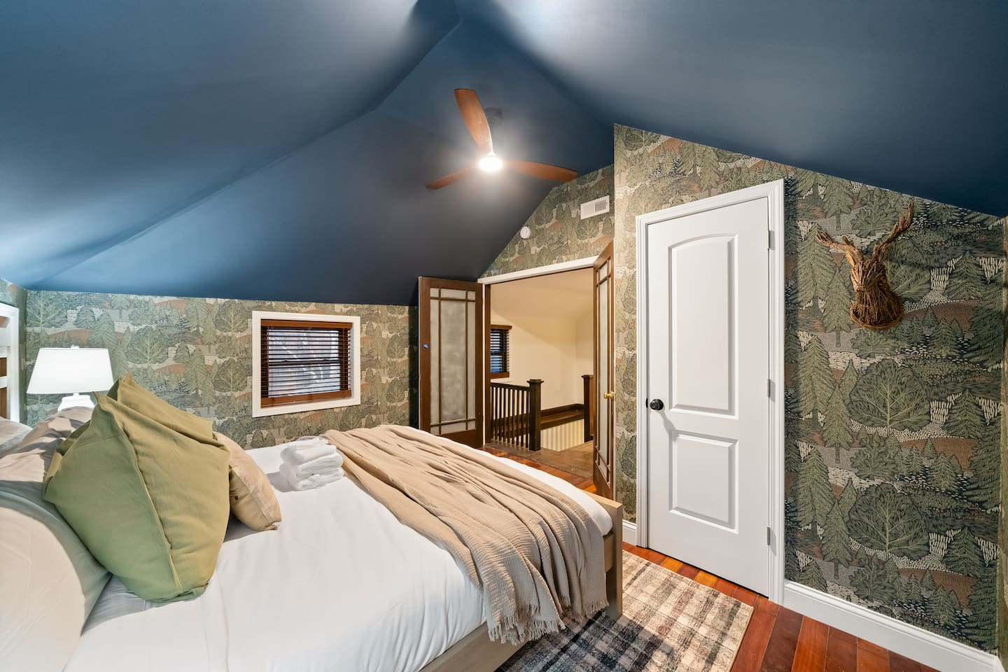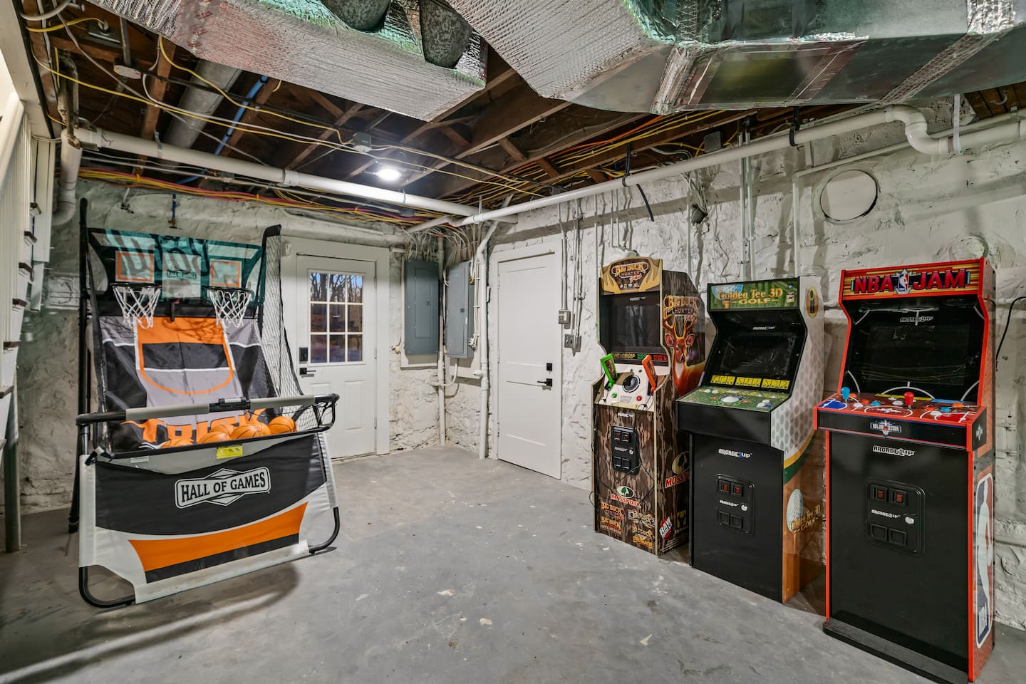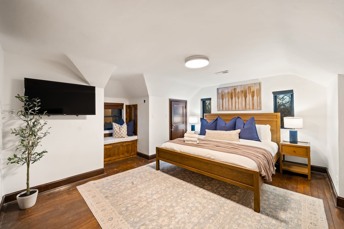 KEY FEATURES: 🌲 Sleeps 21! 5 bedrooms in the main house + 8 beds in the historic creekside cabin (Read more below) 🌲 5 full bathrooms, including a luxurious clawfoot soaking tub & multiple rain showers 🌲 Modern renovated kitchen + full outdoor kitchen with grill, ice trough, & mini fridge 🌲 Zen garden with hot tub, sauna, cold plunge, & outdoor shower 🌲 Firepit lounge w/ natural gas + outdoor dining for 21 🌲 Stargazing dome, movie theater, swing set & rock wall 🌲 Private disc golf course, archery range, treehouse, & tug-a-war 🌲 Outdoor games like bucket golf & portable soccer nets 🌲 Tesla Universal EV Charger w/ Integrated J1772 adapter 🌲 Game room w/ arcade games, pool table, darts, ping pong, & more! 🌲 Fast 3 Gig Google Fiber WiFi + Smart TVs + Netflix access 🌲 Pets welcome ($100 per pet fee) 🌲 Newly renovated, first available stay December 22nd 𖠰 Be Among the First to Stay 𖠰 We are so excited to have started welcoming our first guests in December 2025! The Ev Lodge was designed as a place for families & friends to reconnect where modern comfort meets the nostalgic spirit of summer camp. 𖠰LARGE GROUPS-READ BEFORE BOOKING𖠰 Ev Lodge comfortably sleeps up to 21 guests across two unique spaces. For the best experience with 10+ adults, we strongly recommend only booking mid-March through mid-November. During winter months guests sleeping in the cabin should plan for cozy layers and may prefer to keep kids or cold sensitive guests in the main house. This historic cabin by the creek is a structure dating back to the 1800's where a young President Truman is said to have spent time! It has been transformed into a bunk-style retreat with 4 full-size bunk beds, creating a nostalgic summer camp feel for kids or group getaways. Equipped with an electric fireplace, electric space heater, 3 ceiling fans, AC, and walkie-talkies to stay connected with the main cabin! Located 200 yards away is the main cabin which sleeps 13 guests and features 5 beautifully designed bedrooms, each with a king-size bed and cozy duvet bedding. Two upstairs bedrooms include twin bed sleeping nooks, perfect for little ones. A queen air mattress is stored in the upstairs hallway closet for added flexibility. 𖠰 BATHROOMS 𖠰 With 5 full bathrooms, everyone can get ready without a wait. The main floor primary suite features a clawfoot soaking tub for a touch of spa like indulgence. The second main floor bathroom includes a double vanity, dual rain shower heads, and heated floors! The basement bathroom offers a sleek rainfall shower and allows for easy access for those sleeping at "Camp Truman" by the creek. Each space is stocked with plush towels, toiletries, and thoughtful touches to make your stay effortless. 𖠰 KITCHEN DINING & LOUNGE 𖠰 At the heart of Ev Lodge is a renovated kitchen with stainless steel appliances. It’s perfect for everything from pancake mornings to serving up evening wine hours. Step into your indoor dining for 18 people with a kids table located in the living room. Let in the natural air by opening the 9 foot wide bi-fold doors to access your outdoor kitchen, equipped with a natural gas grill, mini fridge and ice trough. Enjoy outdoor dining for up to 21 guests under the string lights. Back inside, the living room invites you to unwind on a 13.5-foot sectional and gather around the cozy electric fireplace. This room is stocked with board games & arts and crafts so your kids will feel right at home! Unwind watching your favorite show on the large Roku Smart TV equipped with Netflix during your stay. 𖠰 OUTDOOR SPACE 𖠰 Ev Lodge’s 6-acre grounds are where the nostalgia truly happens. Relax in the Zen garden, complete with a hot tub, 4-person sauna, cold plunge, and outdoor shower. Watch the stars from the stargazing dome, toast s’mores at the firepit lounge, or enjoy dinner under the string lights. Adventure seekers will love the private disc golf course, laser tag, archery range, tug-of-war area, soccer nets, and bucket golf! Enjoy your morning coffee in the treehouse overlooking the creek or grab your favorite book and relax on the treehouse hammock floor. The swing set and rock wall are sure to bring out everyone’s inner kid! When the sun sets cue up your favorite film in the outdoor movie theater by the creek. With enough seating for 21 people, it's a perfect end to a perfect day. Just outside of the garage is a Tesla Universal EV Charger w/ Integrated J1772 adapter to conveniently charge any electric vehicle. Whether a Tesla or non-Tesla, get up to 44 mi of range added per hour at 11.5 kW. 𖠰 INDOOR ENTERTAINMENT 𖠰 Rainy days are no problem here. Head to the game room featuring arcade games, foosball, ping pong, pool table, darts, and a KC Current soccer zone! WiFi is lightning-fast (3 Gig Google Fiber) and the house includes a Netflix account. Board games and kids’ crafts are located in the living room to keep everyone entertained. 𖠰 Book Your Stay at The Ev Lodge & Experience Where Luxury Meets Nostalgia 𖠰