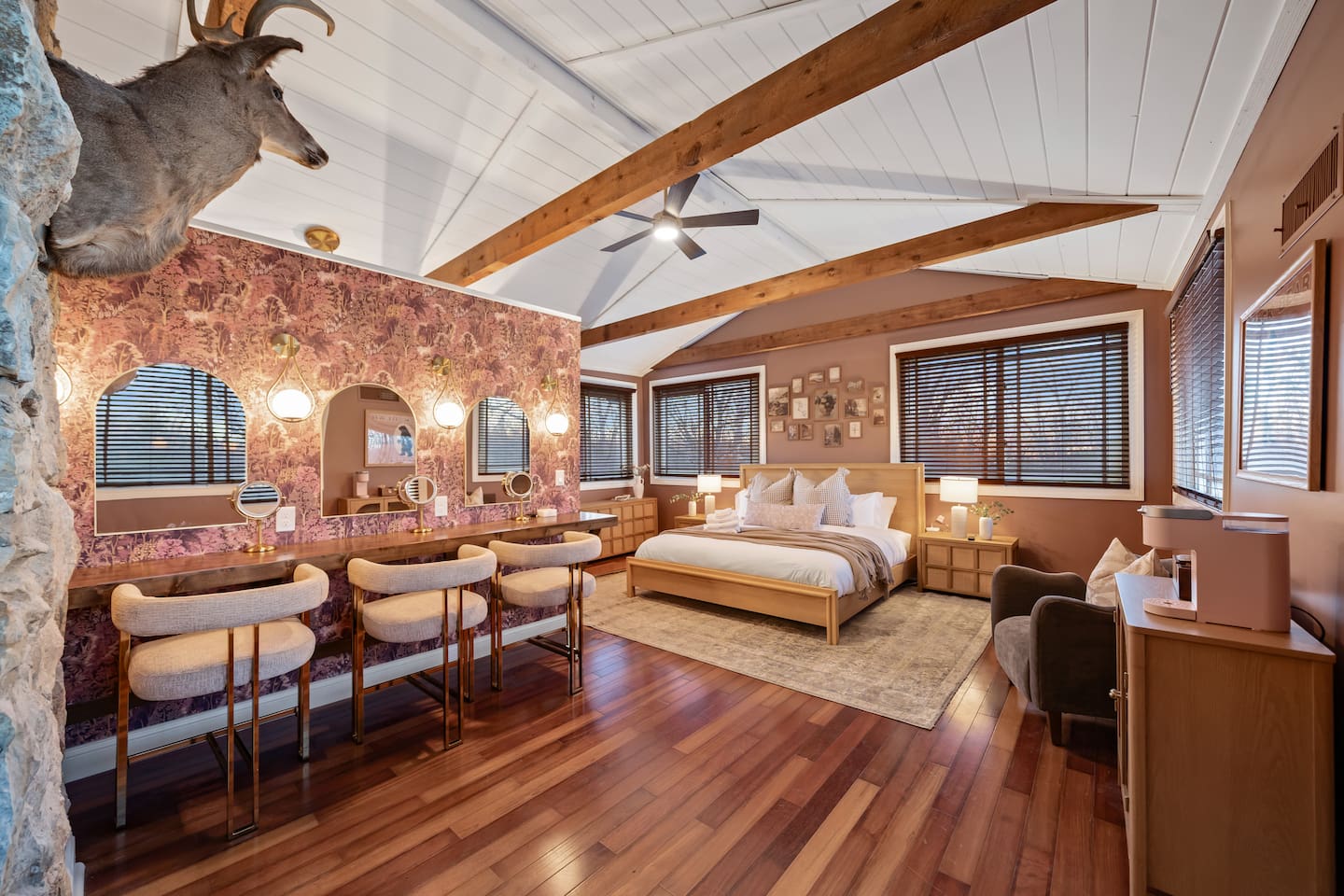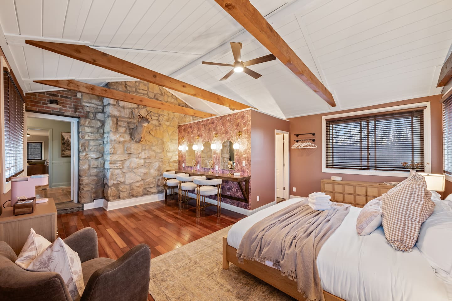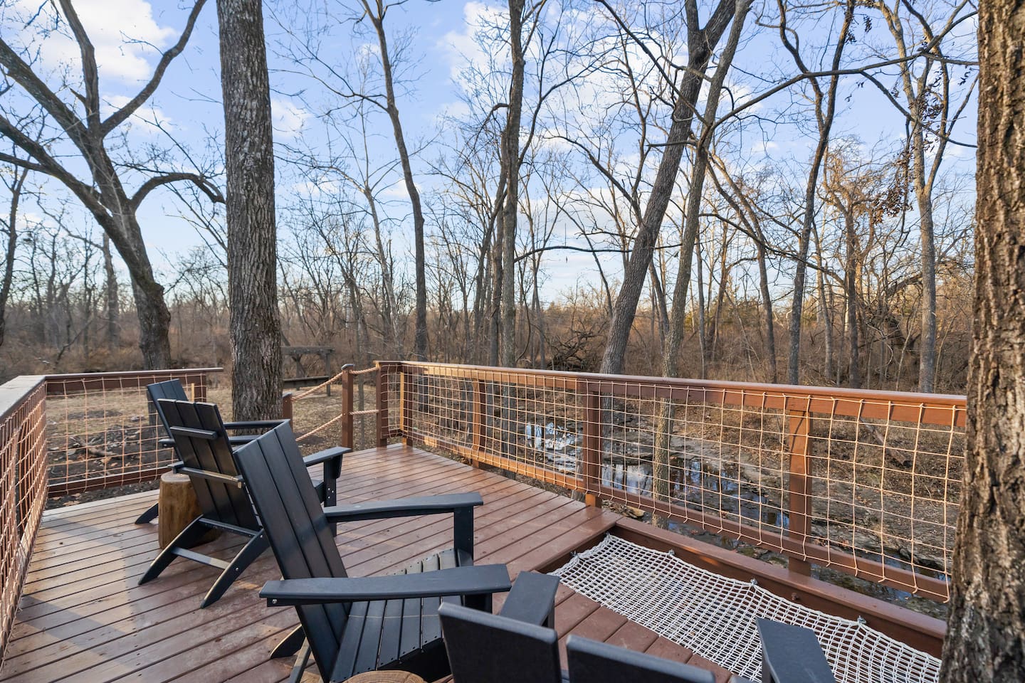 Guests have full access to both the main lodge and the creekside cabin, as well as all indoor and outdoor amenities throughout the 6 acre property. There’s plenty of on-site parking and please no cars should drive or park on the grass. We provide smart lock entry and easy self check-in. Each of the bedrooms are equipped with Roku Smart TVs for your leisure with the exception of the creekside cabin. The property is located only 4 minutes from highway I-49 which allows for easy access to all Kansas City has to offer!