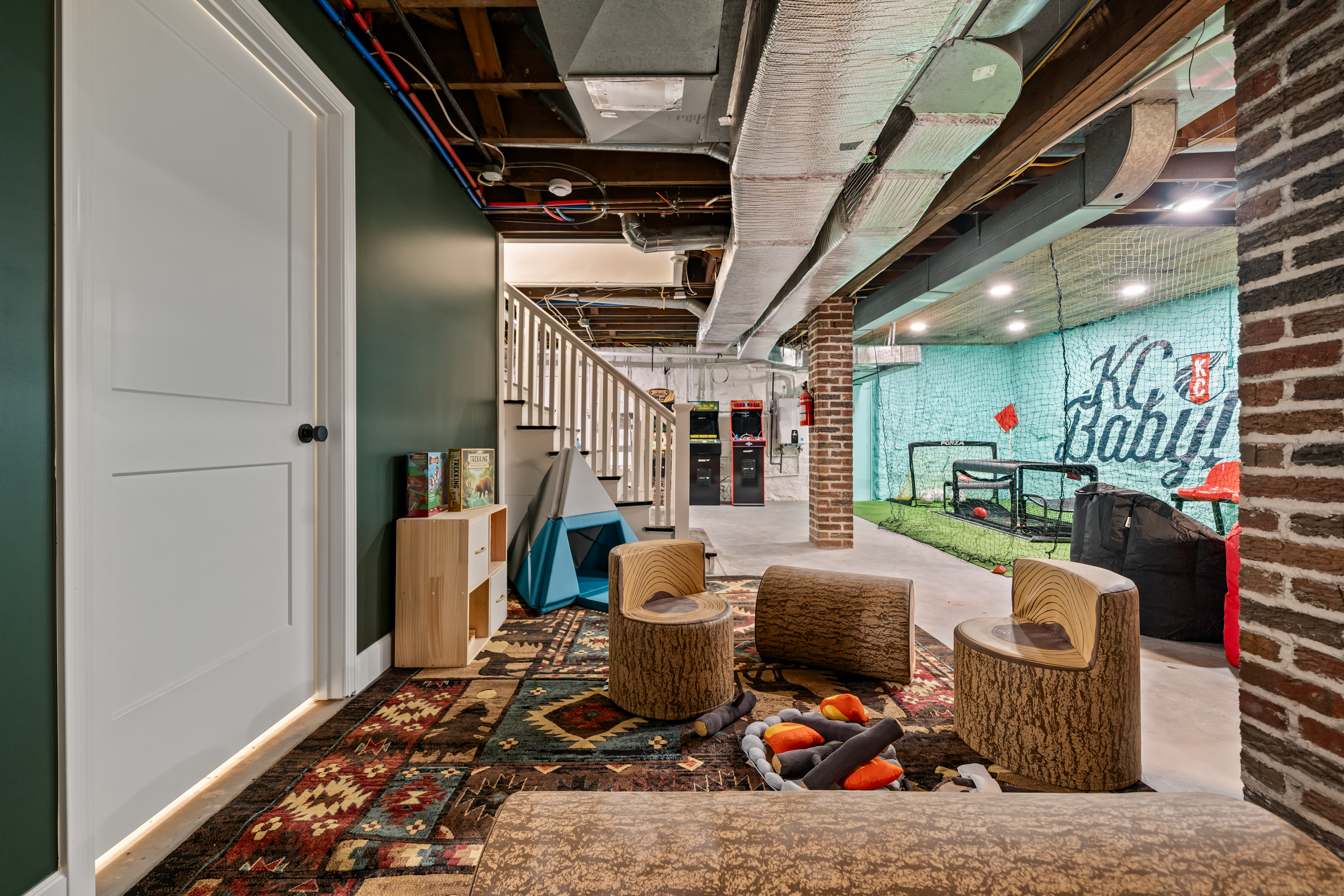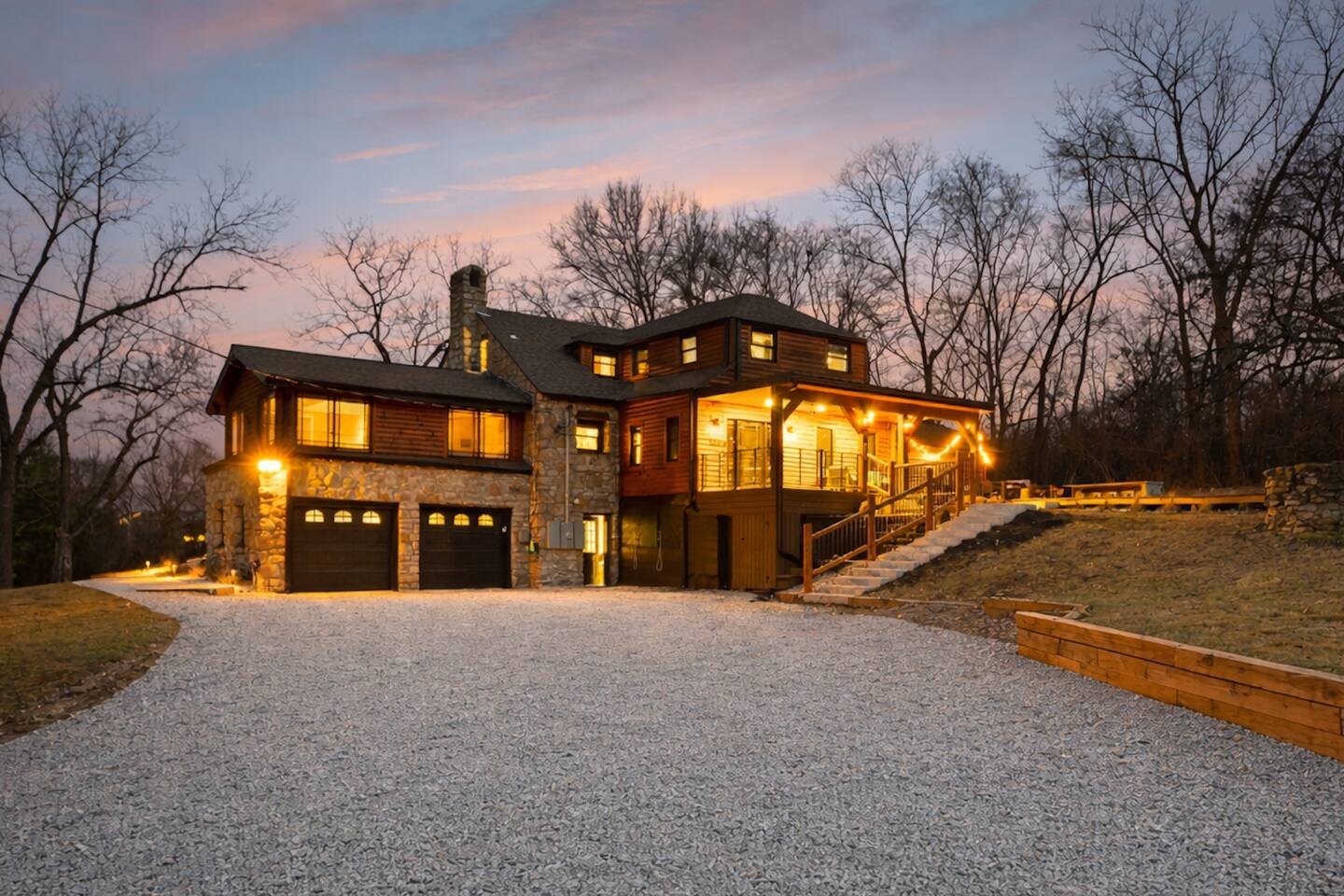 KEY FEATURES: 🌲 Sleeps 21! 5 King bedrooms in the main house + 8 Full beds in the historic creekside cabin (Read more below) 🌲 5 full bathrooms, including a luxurious clawfoot soaking tub & multiple rain showers 🌲 Modern renovated kitchen + full outdoor kitchen with grill, ice trough, & mini fridge 🌲 Zen garden with hot tub, sauna, cold plunge, & outdoor shower 🌲 Firepit lounge w/ natural gas + outdoor dining for 21 🌲 Stargazing dome, movie theater, swing set & rock wall 🌲 Private disc golf course, treehouse, & tug-a-war 🌲 Outdoor games & portable soccer nets 🌲 1V1 Pickleball Court! 🌲 Tesla Universal EV Charger w/ Integrated J1772 adapter 🌲 Game room w/ arcade games, pool table, darts, ping pong, & more! 🌲 Fast 3 Gig Google Fiber WiFi + Smart TVs + Netflix access 🌲 Pets welcome ($100 per pet fee) 🌲 Newly renovated in December 2025! 𖠰 Be Among the First to Stay 𖠰 We are so excited to have started welcoming our first guests in December 2025! The Ev Lodge was designed as a place for families & friends to reconnect where modern comfort meets the nostalgic spirit of summer camp. 𖠰LARGE GROUPS-READ BEFORE BOOKING𖠰 Ev Lodge comfortably sleeps up to 21 guests across two unique spaces. For the best experience with 10+ adults, we strongly recommend only booking mid-March through mid-November. During winter months guests sleeping in the cabin should plan for cozy layers and may prefer to keep kids or cold sensitive guests in the main house. This historic cabin by the creek is a structure dating back to the 1800's where a young President Truman is said to have spent time! It has been transformed into a bunk-style retreat with 4 full-size bunk beds, creating a nostalgic summer camp feel for kids or group getaways. Equipped with an electric fireplace, electric space heater, 3 ceiling fans, AC, and walkie-talkies to stay connected with the main cabin! Located 200 yards away is the main cabin which sleeps 13 guests and features 5 beautifully designed bedrooms, each with a king-size bed and cozy duvet bedding. Two upstairs bedrooms include twin bed sleeping nooks, perfect for little ones. A queen air mattress is stored in the upstairs hallway closet for added flexibility. 𖠰 BATHROOMS 𖠰 With 5 full bathrooms, everyone can get ready without a wait. The main floor primary suite features a clawfoot soaking tub for a touch of spa like indulgence. The second main floor bathroom includes a double vanity, dual rain shower heads, and heated floors! The basement bathroom offers a sleek rainfall shower and allows for easy access for those sleeping at "Camp Truman" by the creek. Each space is stocked with plush towels, toiletries, and thoughtful touches to make your stay effortless. 𖠰 KITCHEN DINING & LOUNGE 𖠰 At the heart of Ev Lodge is a renovated kitchen with stainless steel appliances. It’s perfect for everything from pancake mornings to serving up evening wine hours. Step into your indoor dining for 18 people with a kids table located in the living room. Let in the natural air by opening the 9 foot wide bi-fold doors to access your outdoor kitchen, equipped with a natural gas grill, mini fridge and ice trough. Enjoy outdoor dining for up to 21 guests under the string lights. Back inside, the living room invites you to unwind on a 13.5-foot sectional and gather around the cozy electric fireplace. This room is stocked with board games & arts and crafts so your kids will feel right at home! Unwind watching your favorite show on the large Roku Smart TV equipped with Netflix during your stay. 𖠰 OUTDOOR SPACE 𖠰 Ev Lodge’s 6-acre grounds are where the nostalgia truly happens. Relax in the Zen garden, complete with a hot tub, 4-person sauna, cold plunge, and outdoor shower. Watch the stars from the stargazing dome, toast s’mores at the firepit lounge, or enjoy dinner under the string lights. Adventure seekers will love the private disc golf course, tug-of-war, rock wall, soccer nets, flag football, and more! Enjoy your morning coffee in the treehouse overlooking the creek or grab your favorite book and relax on the treehouse hammock floor. The swing set and rock wall are sure to bring out everyone’s inner kid! When the sun sets cue up your favorite film in the outdoor movie theater by the creek. With enough seating for 21 people, it's a perfect end to a perfect day. Just outside of the garage is a Tesla Universal EV Charger w/ Integrated J1772 adapter to conveniently charge any electric vehicle. Whether a Tesla or non-Tesla, get up to 44 mi of range added per hour at 11.5 kW. 𖠰 INDOOR ENTERTAINMENT 𖠰 Rainy days are no problem here. Head to the game room featuring arcade games, foosball, ping pong, pool table, darts, and a KC Current soccer zone! WiFi is lightning-fast (3 Gig Google Fiber) and the house includes a Netflix account. Board games and kids’ crafts are located in the living room to keep everyone entertained. 𖠰 Book Your Stay at The Ev Lodge & Experience Where Luxury Meets Nostalgia 𖠰